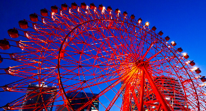 우메다역(梅田駅)에서 도보 3분에 도착할 수 있는 접근성이 좋은 장소에 HEP FIVE 관람차(観覧車)가 있다. 빌딩의 옥상에 서 있는 빨간 관람차의 뼈대가 인상적이다. 높은 위치에서 승차하기 때문에 비교적 빨리 반짝반짝 빛나는 야경을 볼 수 있다. 관람차가 한 바퀴 도는 데는 15분 정도가 걸린다. 둘만의 특별한 시간을 충분히 즐길 수 있다.